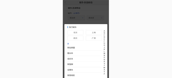 jQuery移动端城市区县二级联动选择代码,支持根据拼音首字母查找城市的手机城市区县选择代码。