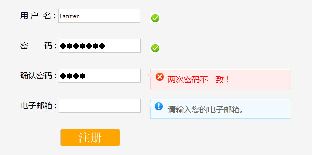 一款简单常用的网站会员注册表单验证提示代码,检查输入的用户名密码等信息是否符合规则,给出相应的提示。