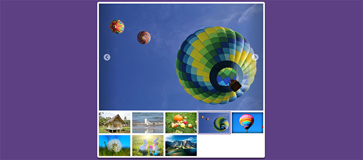 基于vue.js构建的简单图片相册幻灯片轮播切换代码,响应式幻灯片大图切换展示效果,点击小图或者箭头按钮控制切换。