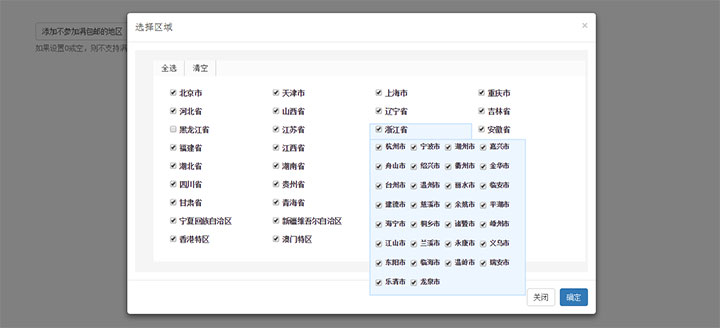 jQuery点击遮罩弹出多城市地区选择代码,适用于购物商城包邮城市选择,支持全选/清空,相当强大实用。