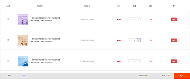 这是一款jQuery+Bootstrap布局购物车结算页面代码,支持商品数量加减、全选、自动计算金额等。