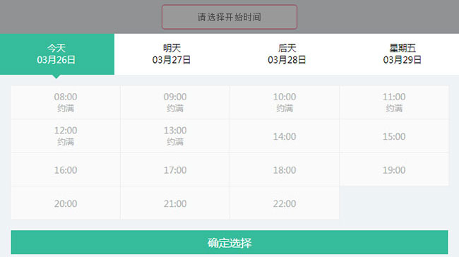 一款简洁美观的jQuery手机端点击遮罩弹出预约时间选择代码,适合做移动端时间选择功能。默认参数通过url末尾数值传递“?type=33 ?type=34 ?type=35 ” 自行选择修改。