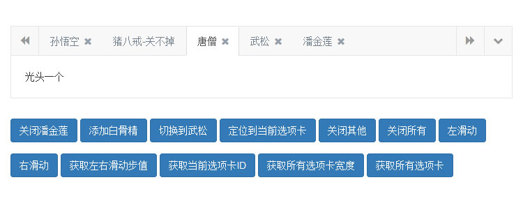 一款功能强大的jQuery选项卡代码,Bootstrap自定义选项卡插件支持关闭,添加,切换到定位,定位到当前,关闭其他,关闭所有,左滑动,右滑动,获取左右滑动步值,获取当前选项卡ID,获取所有选项卡宽度,获取所有选项卡功能代码等。