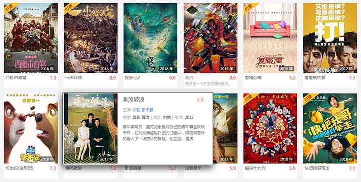 一款简单的div+css鼠标悬停图文列表详情展示代码,这里是用于电影列表展示,鼠标悬停显示更多电影的信息内容介绍。