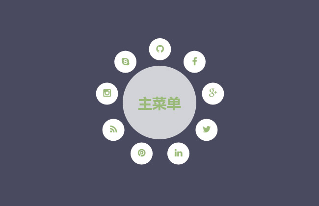 CSS3圆形环绕菜单动画特效是一款在鼠标经过的时候,所有的子菜单会依次出现,并以动画的方式环绕在圆形主菜单周围的网页导航菜单代码。