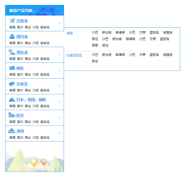 这是一款蓝色样式风格旅游网站常用的分类菜单代码,jQuery左侧分类导航菜单特效。