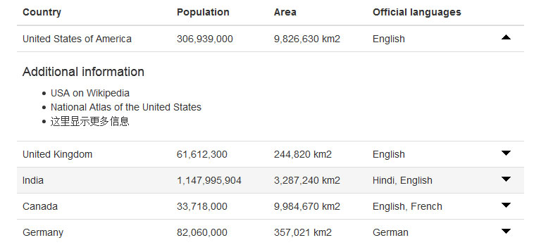 这是一款相当实用的jQuery基于Bootstrap.js表格行展开收缩隐藏代码,用来显示隐藏表格行内容,点击后箭头指向也会改变。