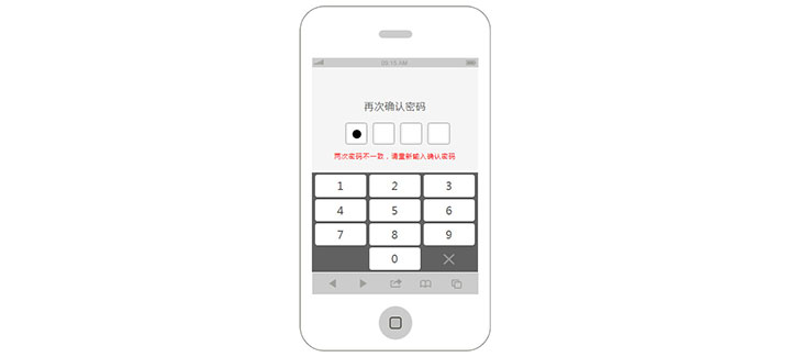 这是一款jQuery仿手机锁屏解锁密码验证代码,触屏输入4位密码,两次密码如果输入不一致,会有红字错误提示。